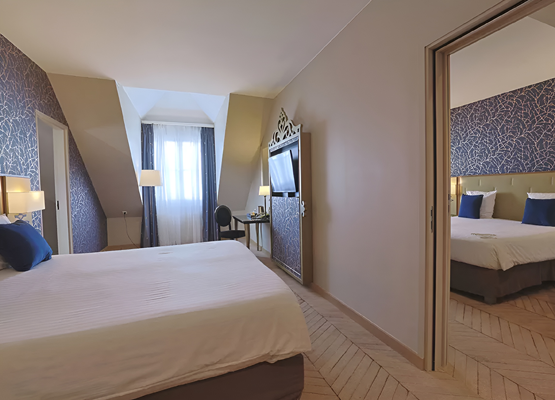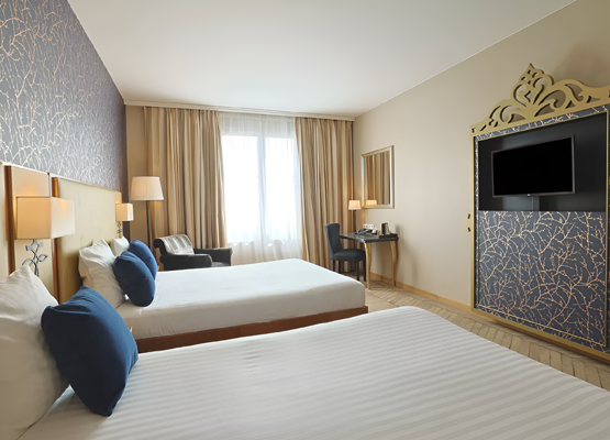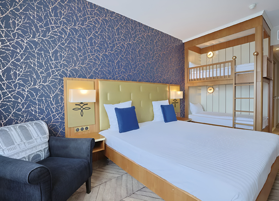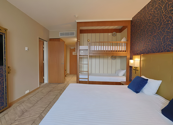 The air - conditioned standard rooms come with either a king size bed with two bunk beds*, or two queen size beds.